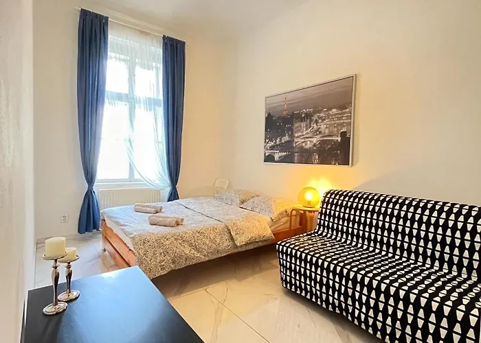 Per un maggiore comfort, l'appartamento dispone di un angolo cottura attrezzato con un bollitore elettrico, un frigo e utensili da cucina. Un tavolo da pranzo sono a disposizione per un'esperienza culinaria più piacevole. Gli ospiti possono anche cenare al ristorante Spojka Karlin, situato a circa 5 minuti a piedi. La stazione degli autobus più vicina, Prokopovo namesti, è a 450 metri.